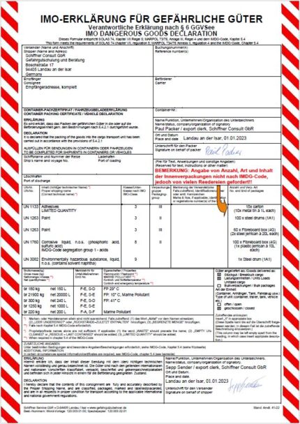 Gefahrgut See – Spezialpapier für Word-Dokumentenvorlage zur Erstellung der IMO Erklärung